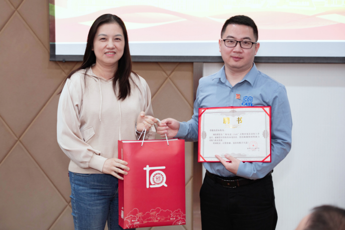 自由交流环节将活动现场气氛推向高潮。师生们与黄标校友围绕行业动态、职业发展路径等话题展开深入探讨,现场互动频繁,交流氛围热烈。为感谢黄标校友的精彩分享与大力支持,学院特别举行了聘书与纪念品颁发仪式,由邵艳群老师、陈小欢老师代表学院为其颁发纪念品与聘书。