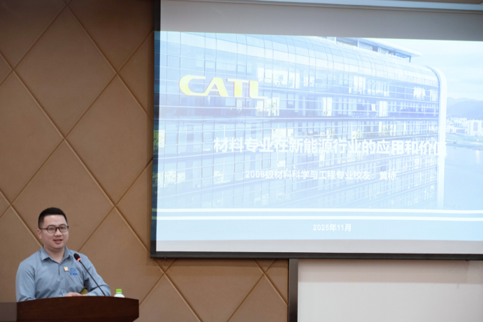 在随后进行的校友主题分享环节,宁德时代新能源公司电芯工艺工程部电芯工艺开发经理、校友黄标先生,结合自身在新能源材料领域的丰富经验,深入剖析了行业现状、发展趋势及关键技术,并分享了宝贵的职业成长心得。他的精彩发言引发了在场师生的浓厚兴趣和热烈讨论。